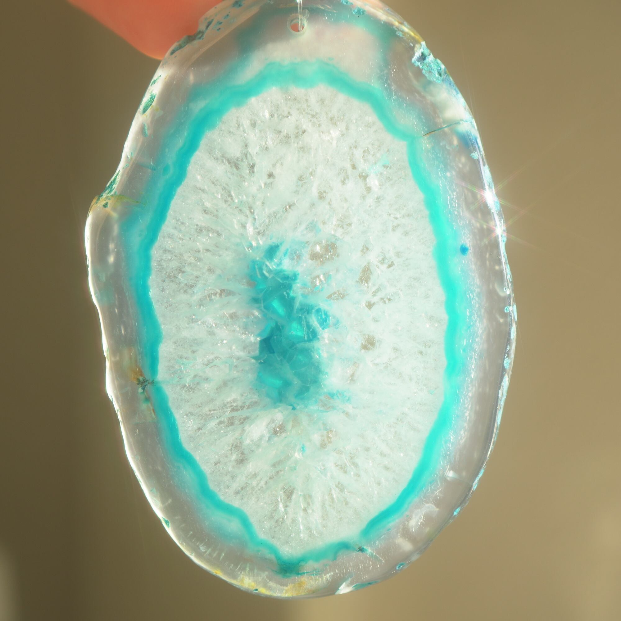 ✧染色の石なので耐光性(光による経年でのカラー変化の耐性)に優れているわけではなくベランダなど一日の中で長時間強い日光に当たるような場所に飾られるのはおすすめしないのですが、陽光に透かした時にだけ真価を発揮する美しさがありますので、是非、時折翳したりして光と一緒にお楽しみいただけたらと思います。特に濃い鮮やかな色など、色変化が気になられる場合は、日光のあまり当たらない場所に飾ってくださいね✧