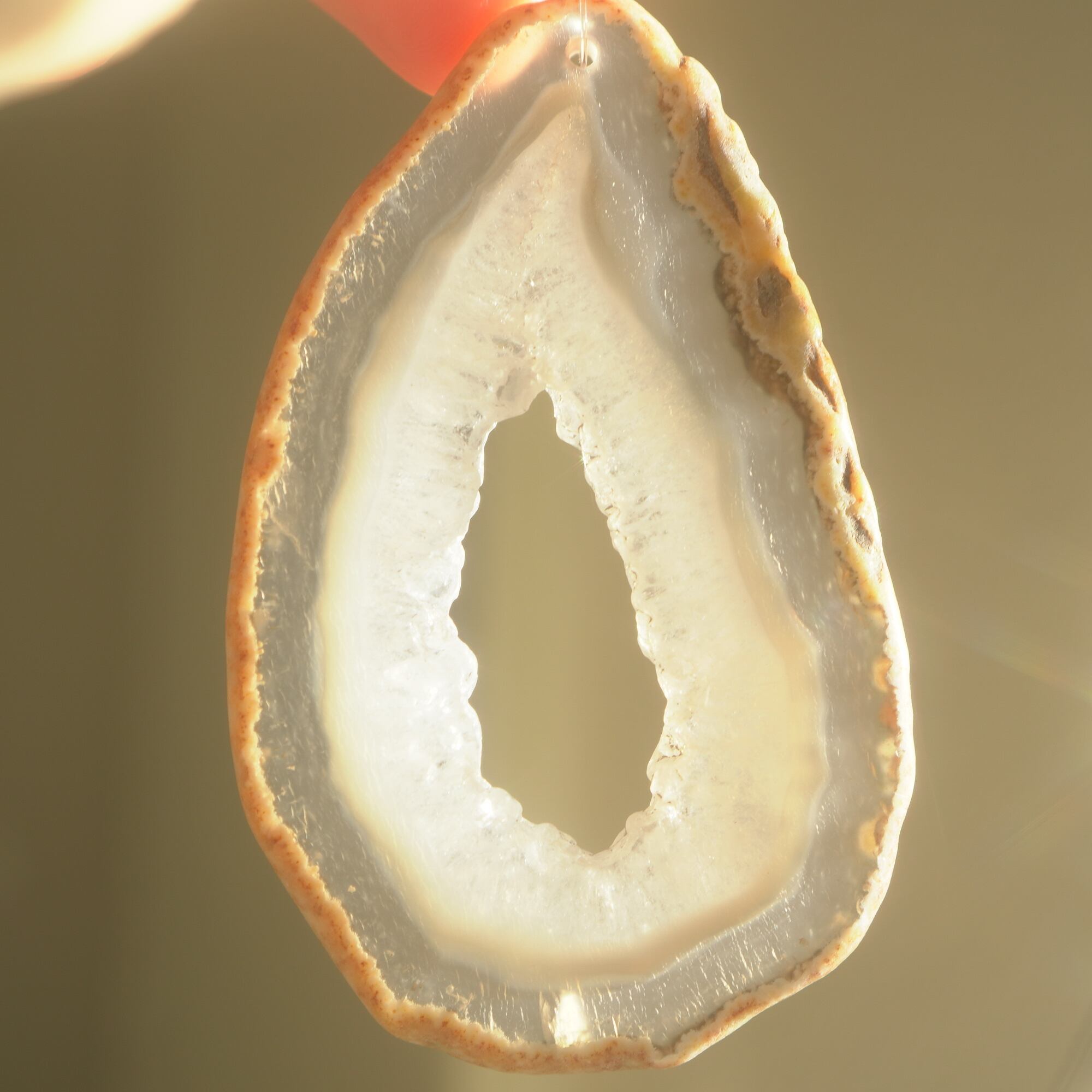 重ねる石同士の側面の加工状態によっても良い音が鳴ったり鳴らなかったり、石の見た目だけで組み合わせを決められないことが難しいポイントでもあるのですが、そんな中、たくさんの石の中から選ばれた5枚のスライスアゲートから出来上がったチャイムたちは、どこか悠々自適に空を泳ぐ妖精のようでもあり、それぞれの音を楽しそうに奏でてくれます。