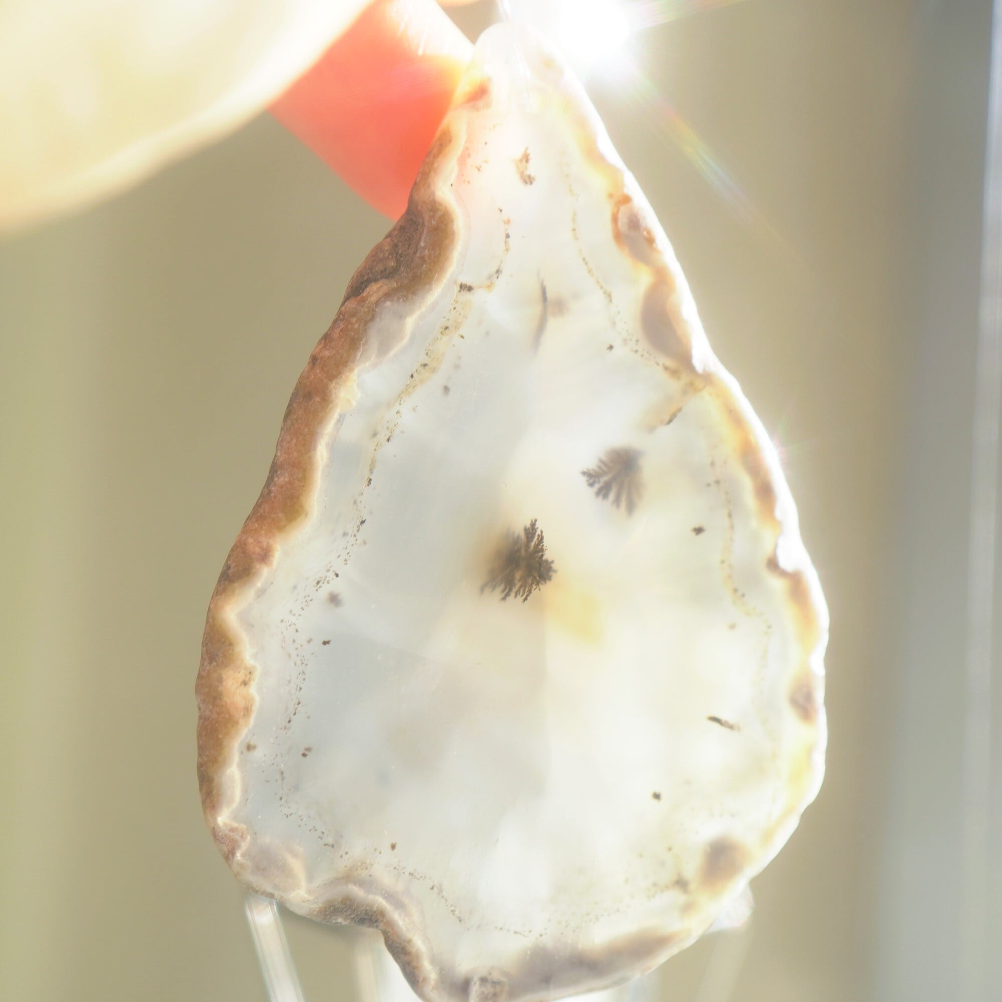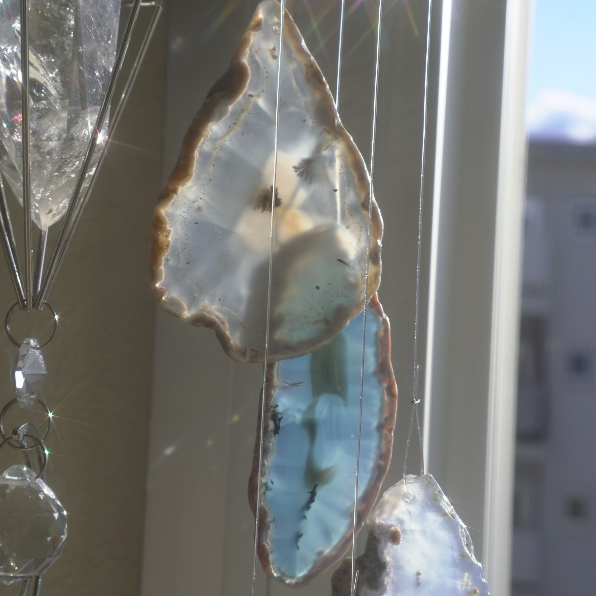 重ねる石同士の側面の加工状態によっても良い音が鳴ったり鳴らなかったり、石の見た目だけで組み合わせを決められないことが難しいポイントでもあるのですが、そんな中、たくさんの石の中から選ばれた5枚のスライスアゲートから出来上がったチャイムたちは、どこか悠々自適に空を泳ぐ妖精のようでもあり、それぞれの音を楽しそうに奏でてくれます。