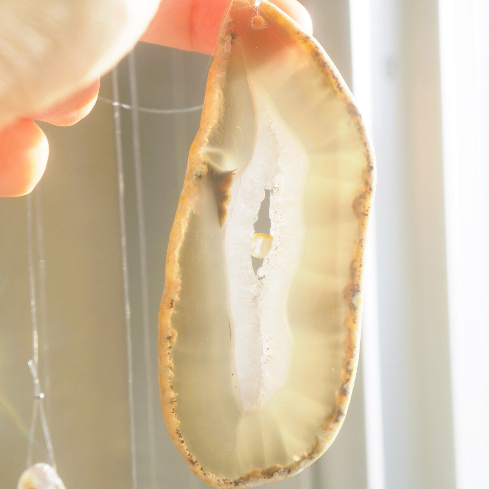 元々の瑪瑙風鈴とは使っている石の大きさや厚みが異なり、こちらのものはそれ同士重ねるだけでは特別音が鳴らない厚さのスライスアゲートを使用しているのですが、間に2本、細長い形状のアゲートを挟むことによって音が鳴る仕組みになっています。(もう少し変則的な組み合わせ方で音が鳴っていることもあります)