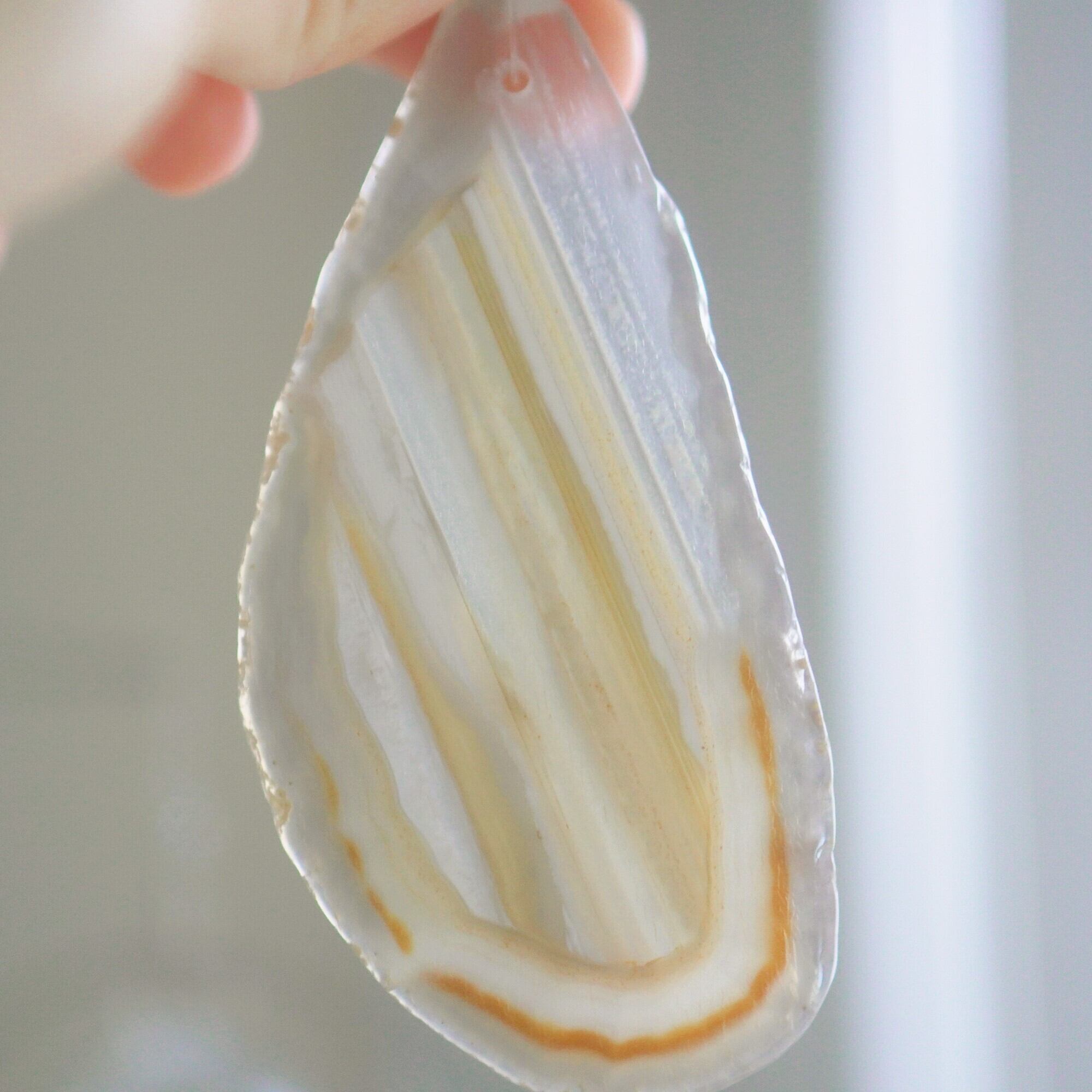 元々の瑪瑙風鈴とは使っている石の大きさや厚みが異なり、こちらのものはそれ同士重ねるだけでは特別音が鳴らない厚さのスライスアゲートを使用しているのですが、間に2本、細長い形状のアゲートを挟むことによって音が鳴る仕組みになっています。(もう少し変則的な組み合わせ方で音が鳴っていることもあります)