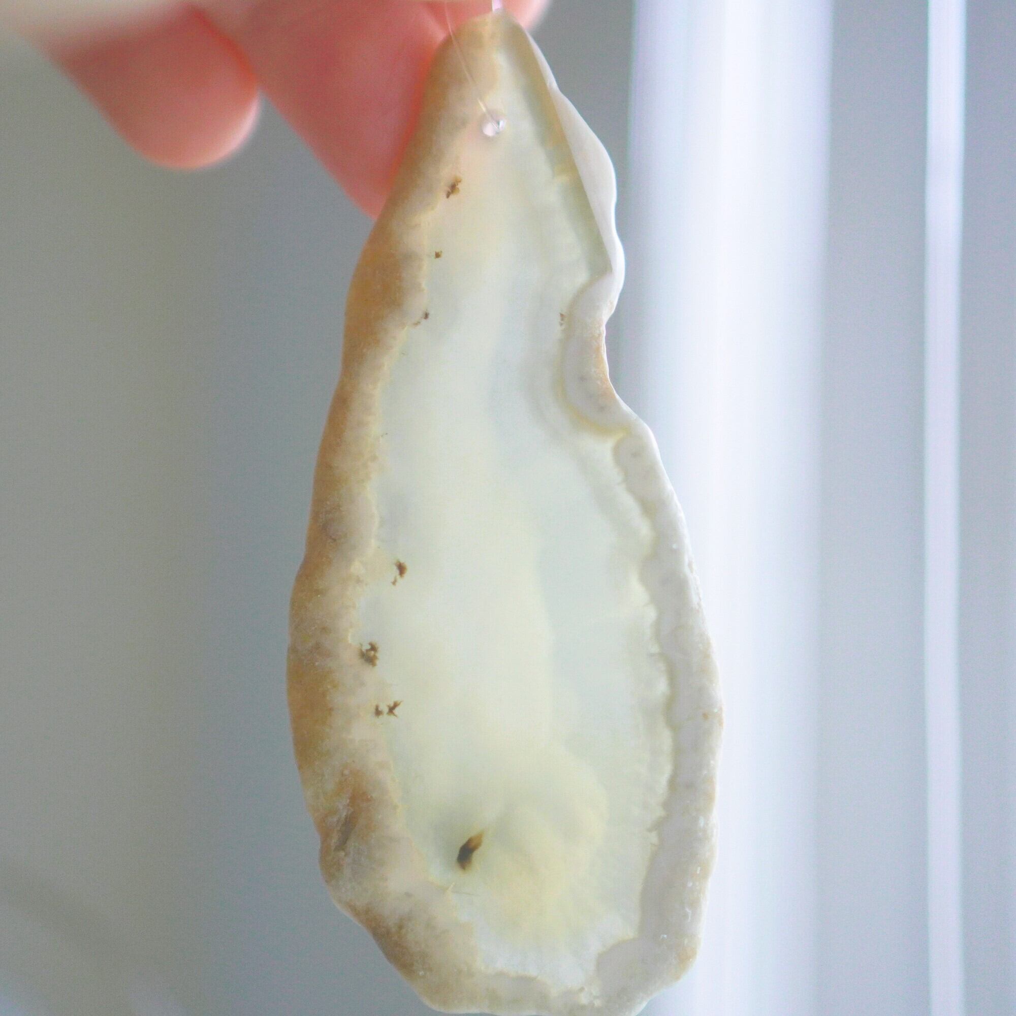 重ねる石同士の側面の加工状態によっても良い音が鳴ったり鳴らなかったり、石の見た目だけで組み合わせを決められないことが難しいポイントでもあるのですが、そんな中、たくさんの石の中から選ばれた5枚のスライスアゲートから出来上がったチャイムたちは、どこか悠々自適に空を泳ぐ妖精のようでもあり、それぞれの音を楽しそうに奏でてくれます。