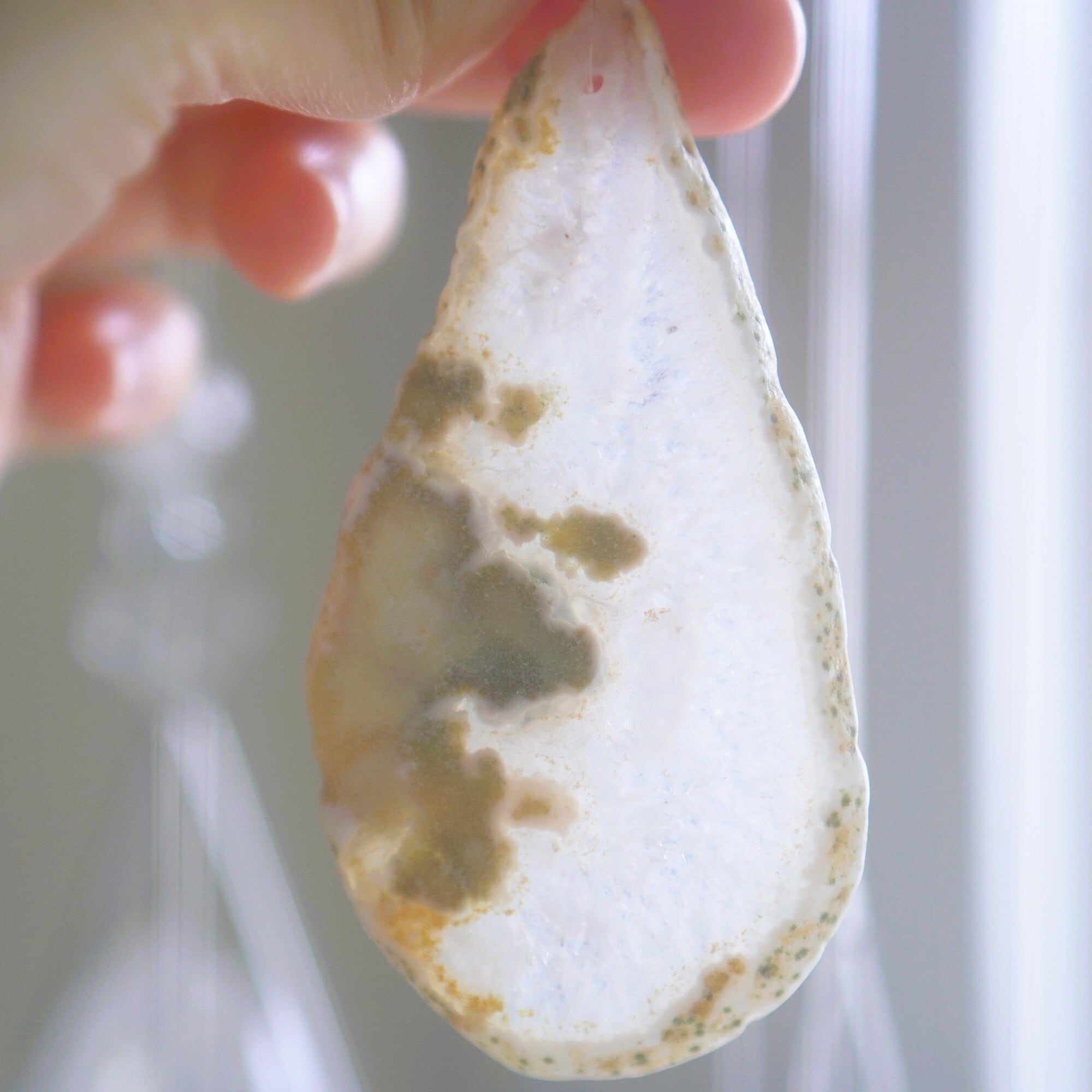 重ねる石同士の側面の加工状態によっても良い音が鳴ったり鳴らなかったり、石の見た目だけで組み合わせを決められないことが難しいポイントでもあるのですが、そんな中、たくさんの石の中から選ばれた5枚のスライスアゲートから出来上がったチャイムたちは、どこか悠々自適に空を泳ぐ妖精のようでもあり、それぞれの音を楽しそうに奏でてくれます。