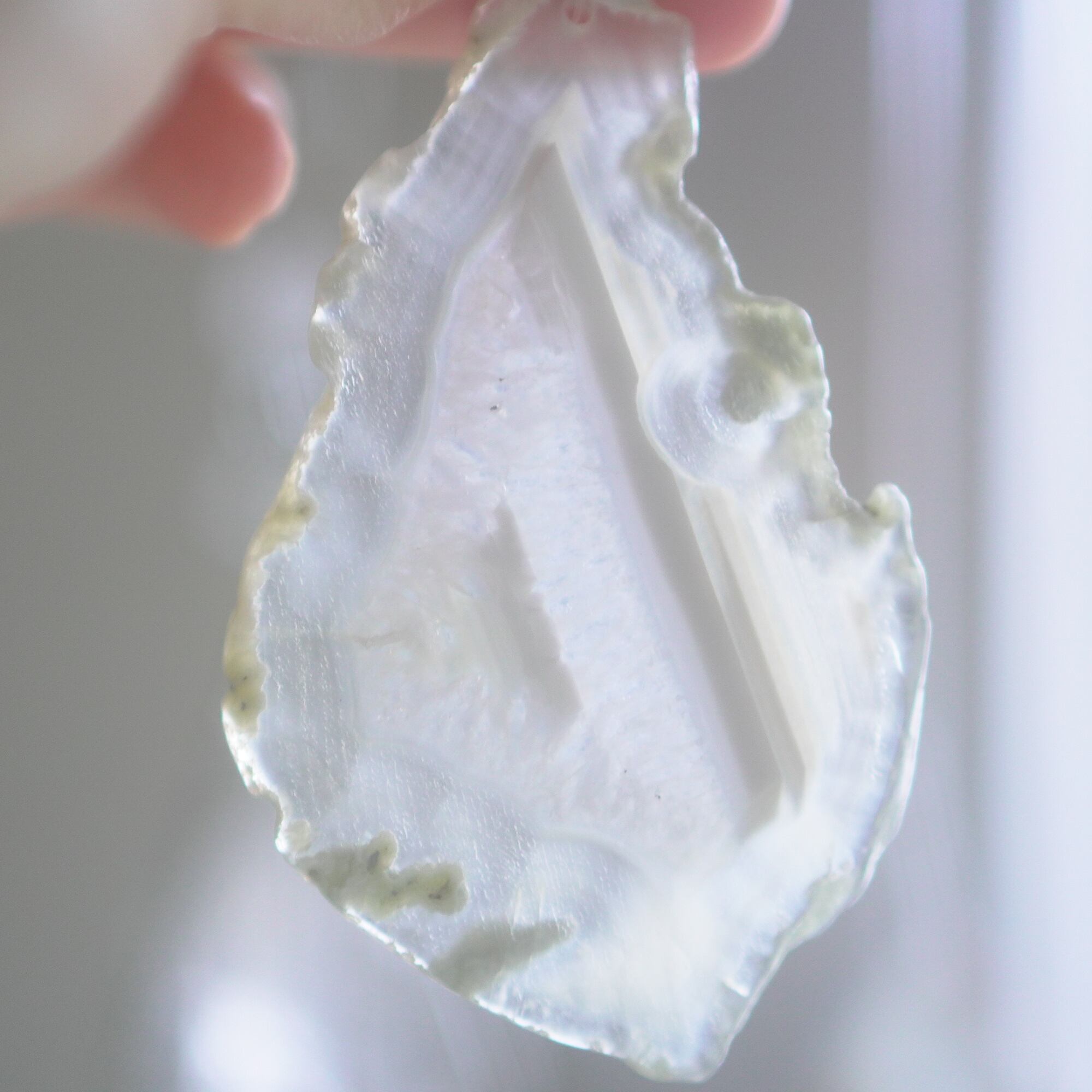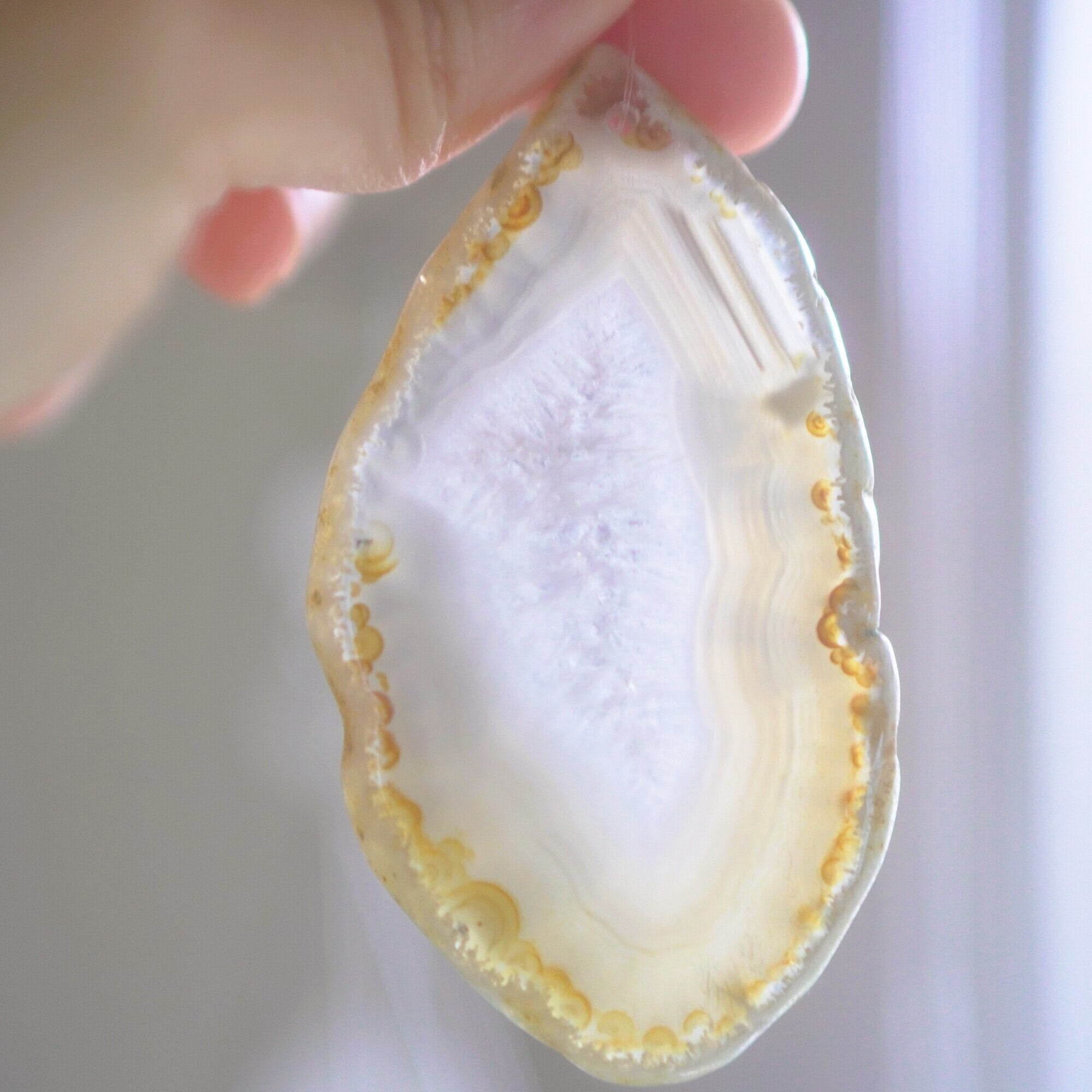 重ねる石同士の側面の加工状態によっても良い音が鳴ったり鳴らなかったり、石の見た目だけで組み合わせを決められないことが難しいポイントでもあるのですが、そんな中、たくさんの石の中から選ばれた5枚のスライスアゲートから出来上がったチャイムたちは、どこか悠々自適に空を泳ぐ妖精のようでもあり、それぞれの音を楽しそうに奏でてくれます。