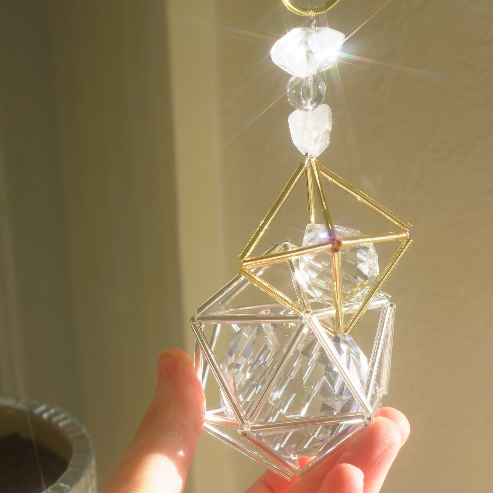 カラフルなガラスのパイプで作ったイコサヘドロンとオクタへドロン(正二十面体と正八面体)をドッキングさせ、鉱石が二粒くっついたようなデザインのサンキャッチャーです。