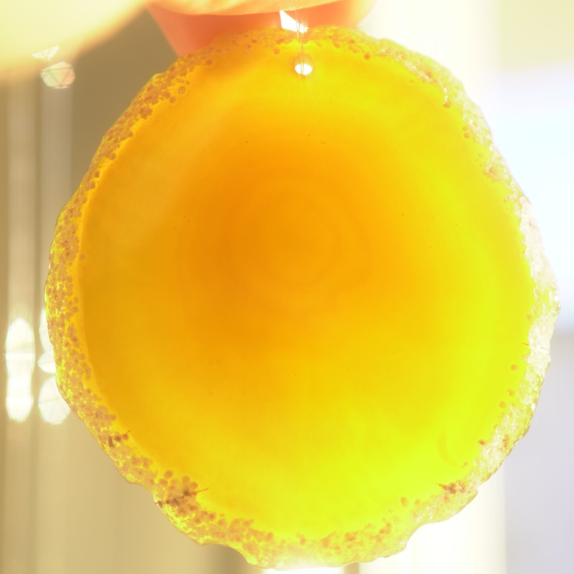 ✧染色の石なので耐光性(光による経年でのカラー変化の耐性)に優れているわけではなくベランダなど一日の中で長時間強い日光に当たるような場所に飾られるのはおすすめしないのですが、陽光に透かした時にだけ真価を発揮する美しさがありますので、是非、時折翳したりして光と一緒にお楽しみいただけたらと思います。特に濃い鮮やかな色など、色変化が気になられる場合は、日光のあまり当たらない場所に飾ってくださいね✧