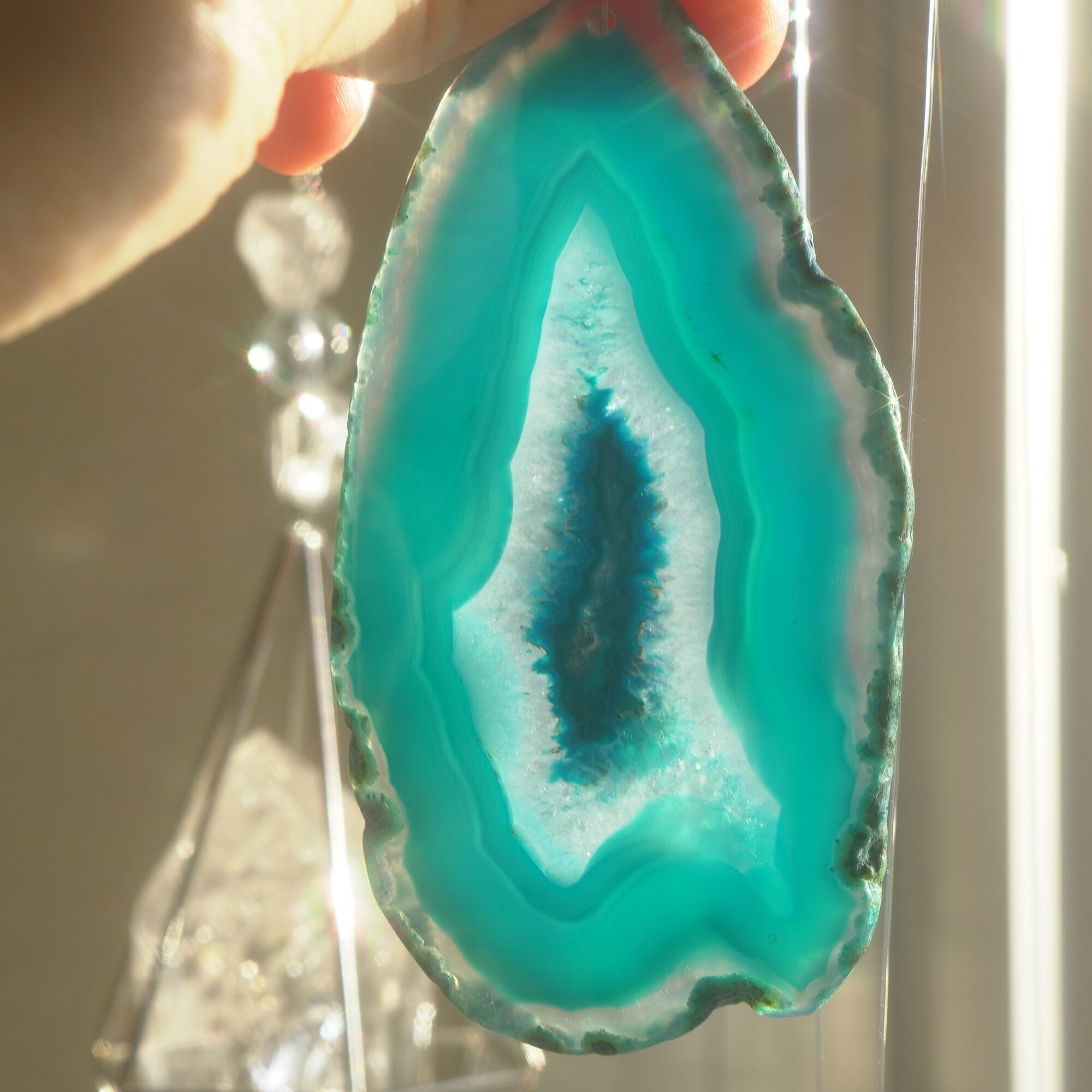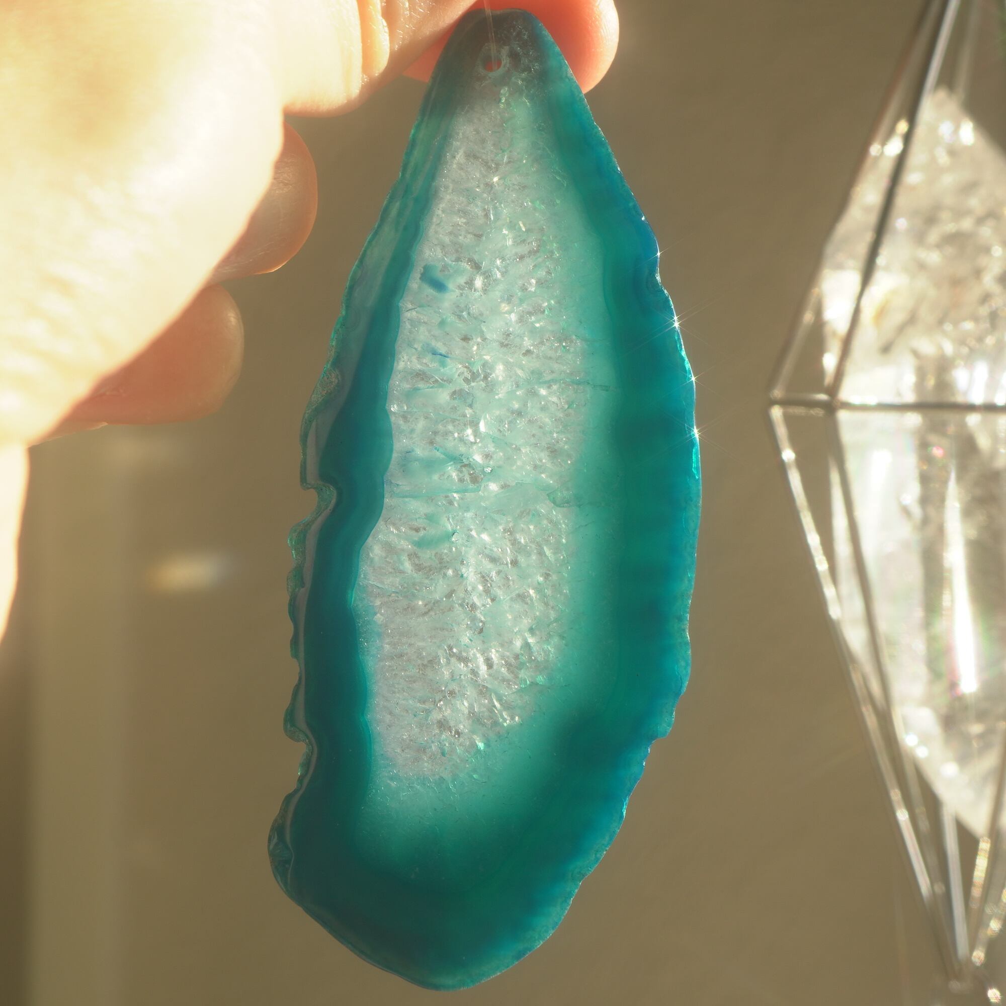 ✧染色の石なので耐光性(光による経年でのカラー変化の耐性)に優れているわけではなくベランダなど一日の中で長時間強い日光に当たるような場所に飾られるのはおすすめしないのですが、陽光に透かした時にだけ真価を発揮する美しさがありますので、是非、時折翳したりして光と一緒にお楽しみいただけたらと思います。特に濃い鮮やかな色など、色変化が気になられる場合は、日光のあまり当たらない場所に飾ってくださいね✧