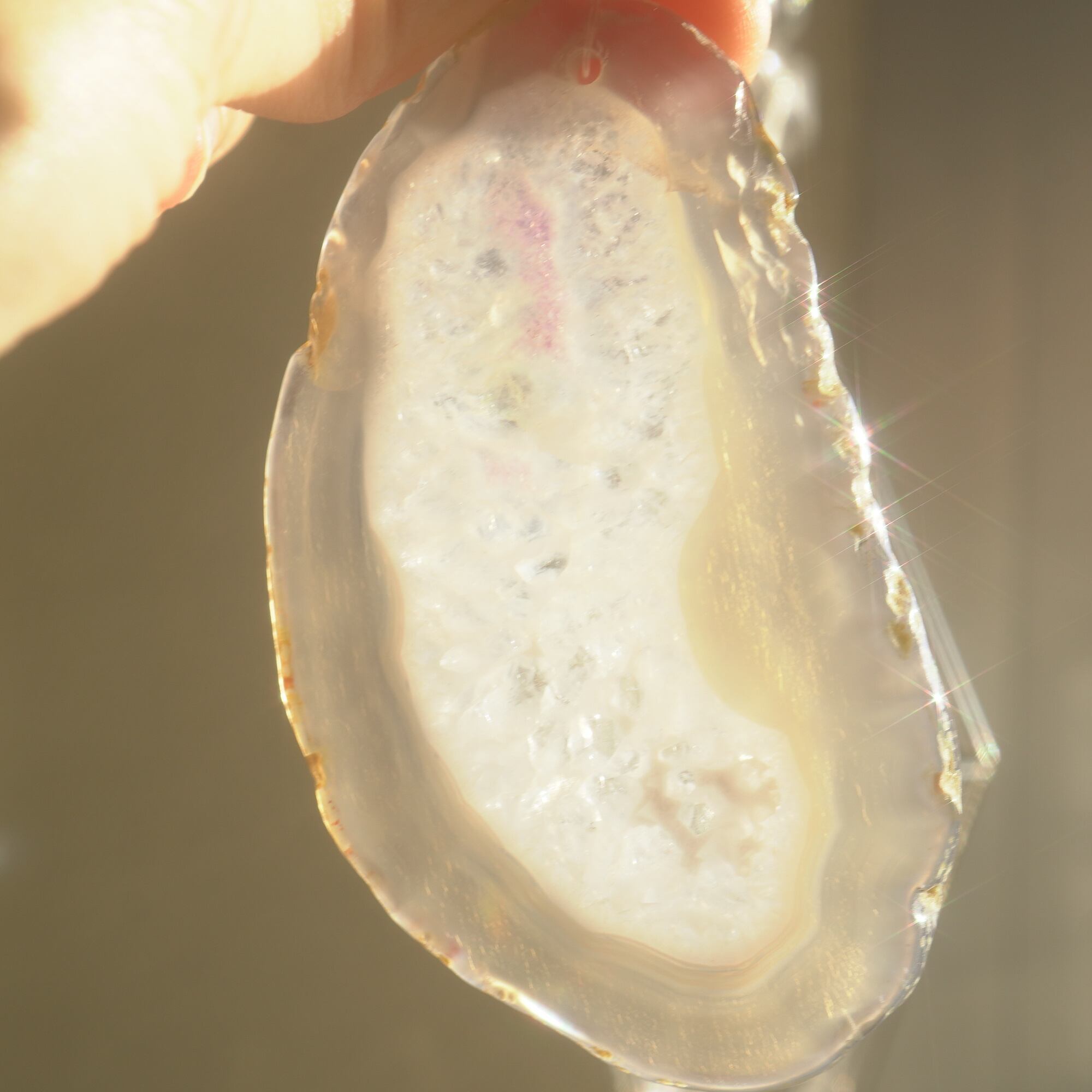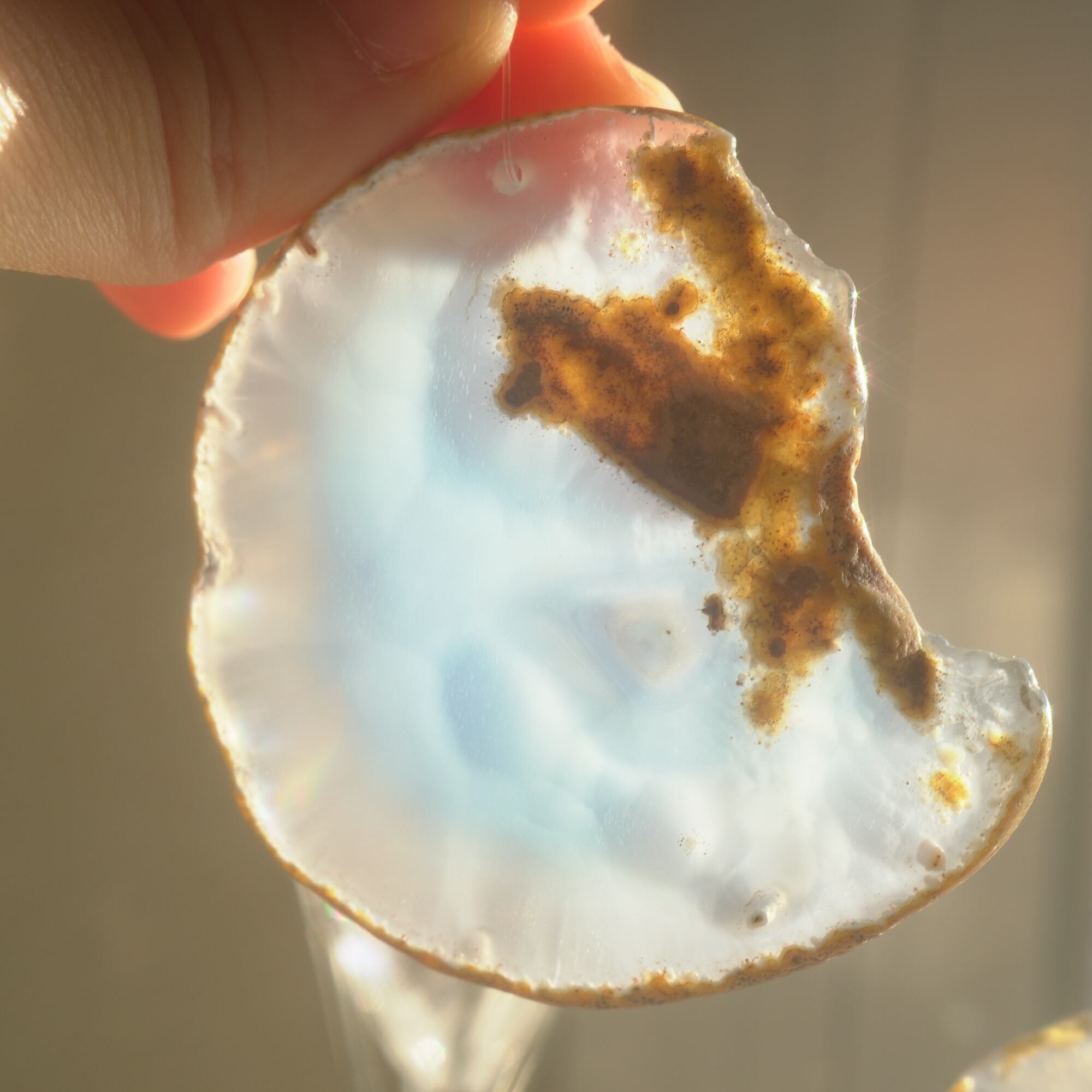 重ねる石同士の側面の加工状態によっても良い音が鳴ったり鳴らなかったり、石の見た目だけで組み合わせを決められないことが難しいポイントでもあるのですが、そんな中、たくさんの石の中から選ばれた5枚のスライスアゲートから出来上がったチャイムたちは、どこか悠々自適に空を泳ぐ妖精のようでもあり、それぞれの音を楽しそうに奏でてくれます。