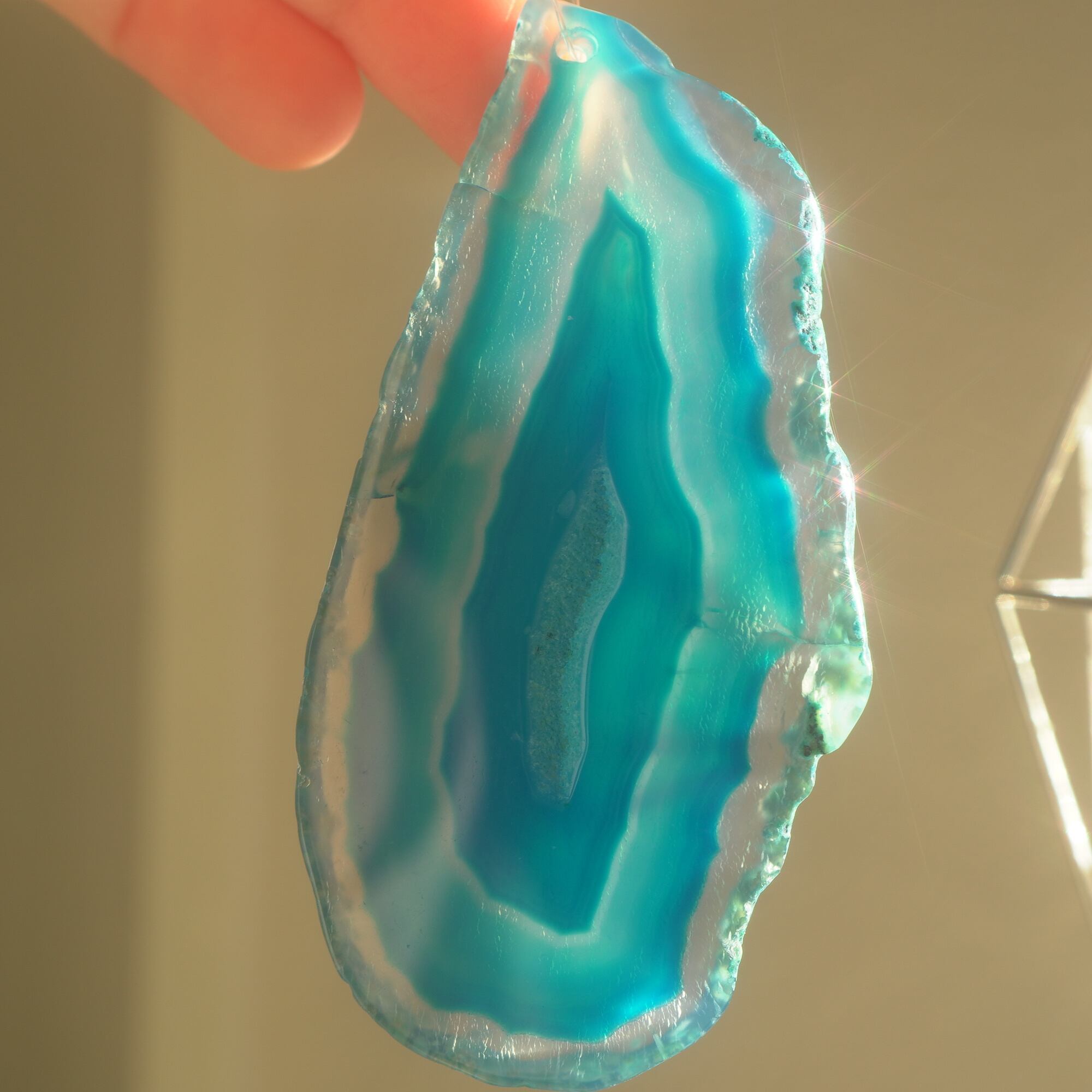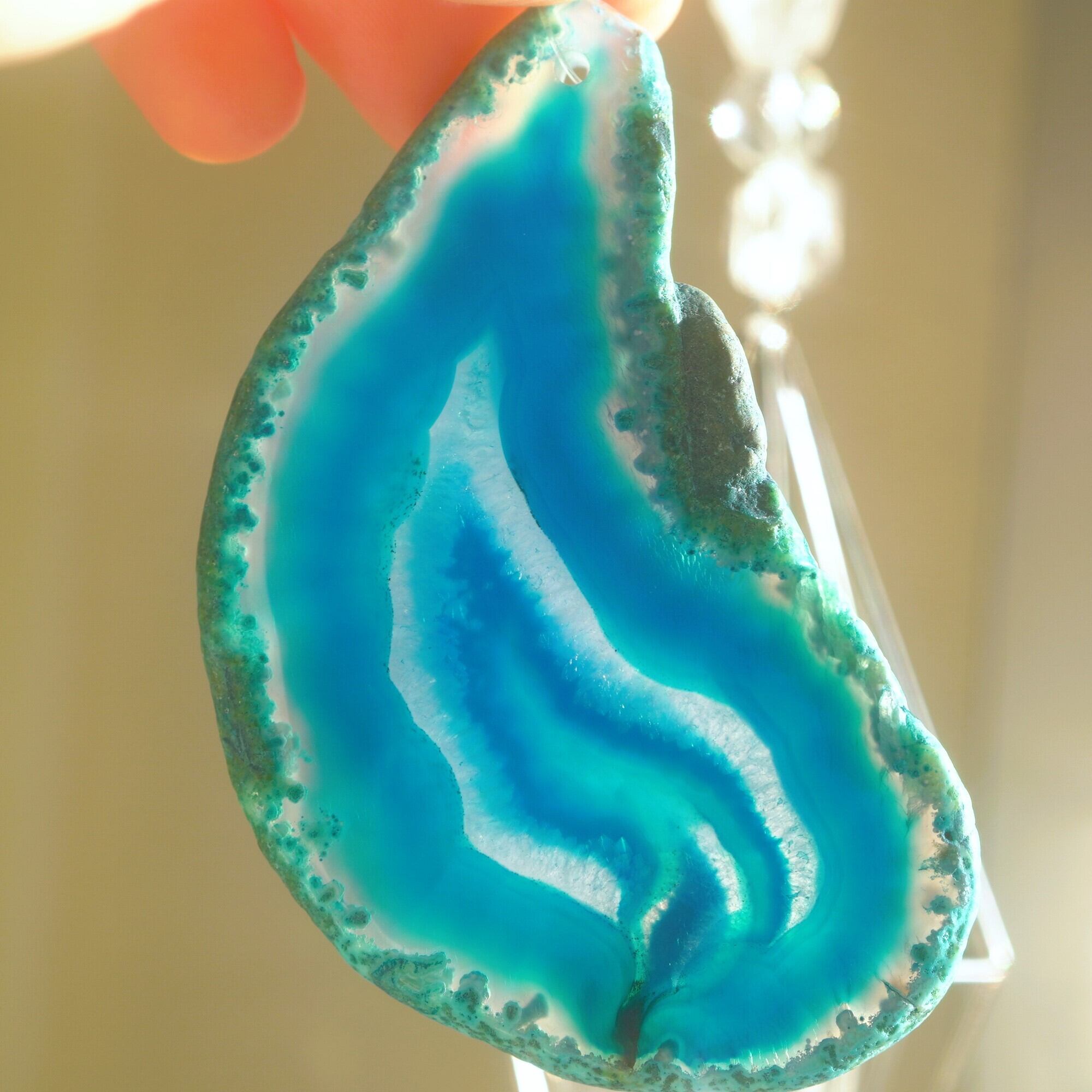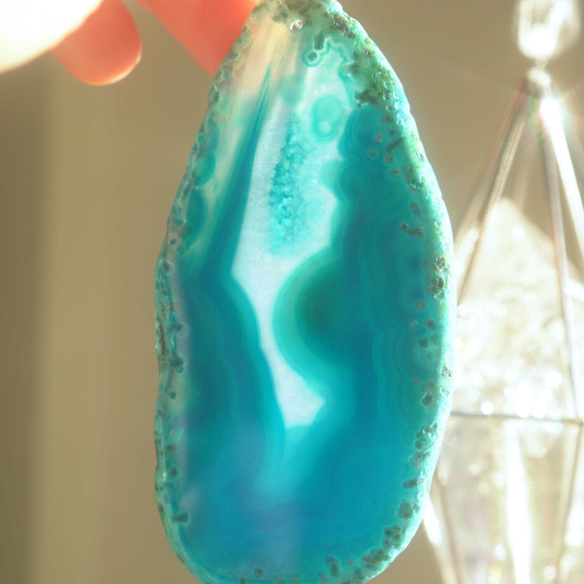 ✧染色の石なので耐光性(光による経年でのカラー変化の耐性)に優れているわけではなくベランダなど一日の中で長時間強い日光に当たるような場所に飾られるのはおすすめしないのですが、陽光に透かした時にだけ真価を発揮する美しさがありますので、是非、時折翳したりして光と一緒にお楽しみいただけたらと思います。特に濃い鮮やかな色など、色変化が気になられる場合は、日光のあまり当たらない場所に飾ってくださいね✧