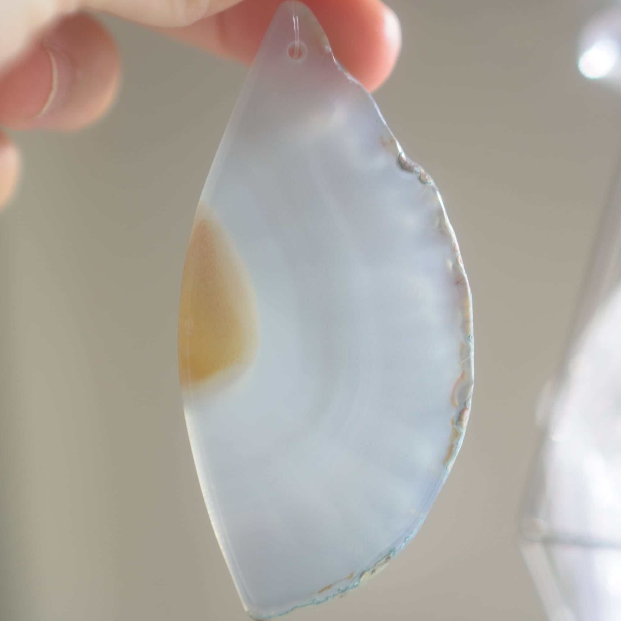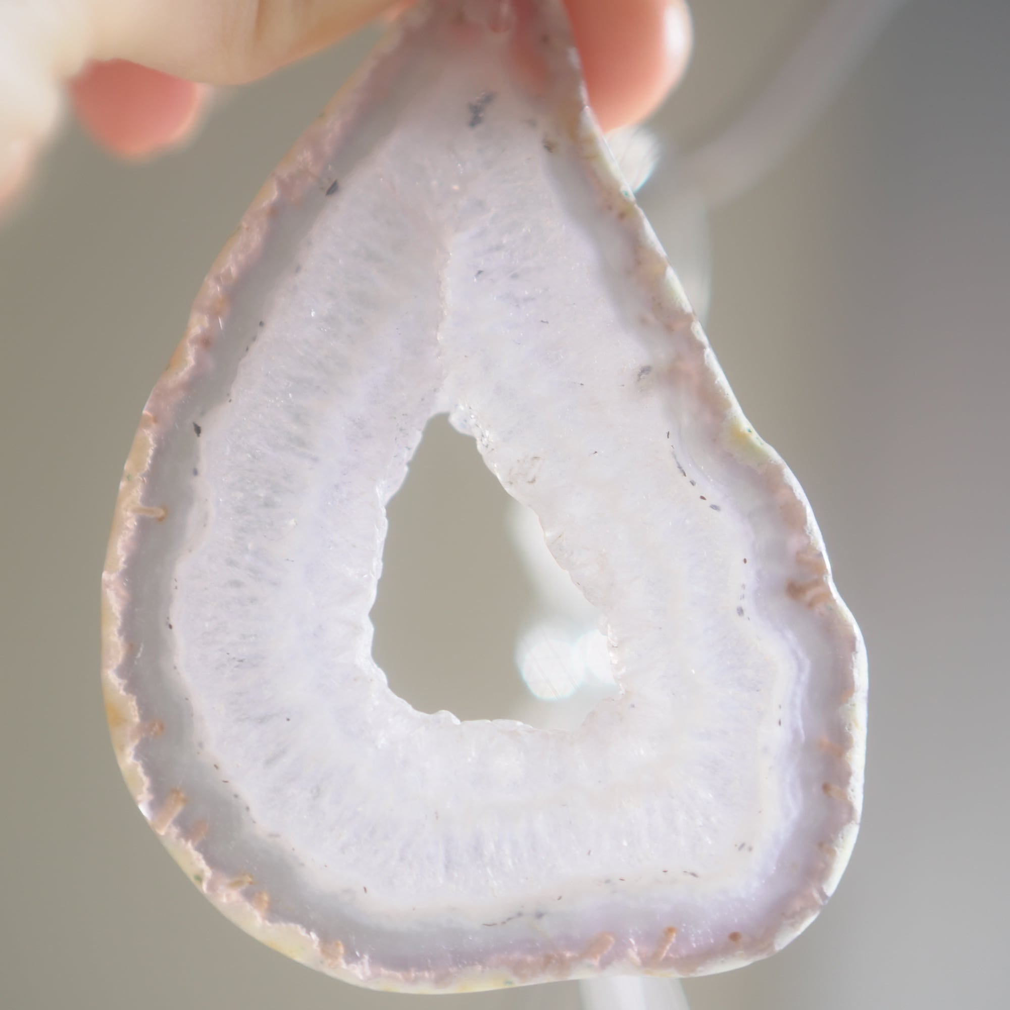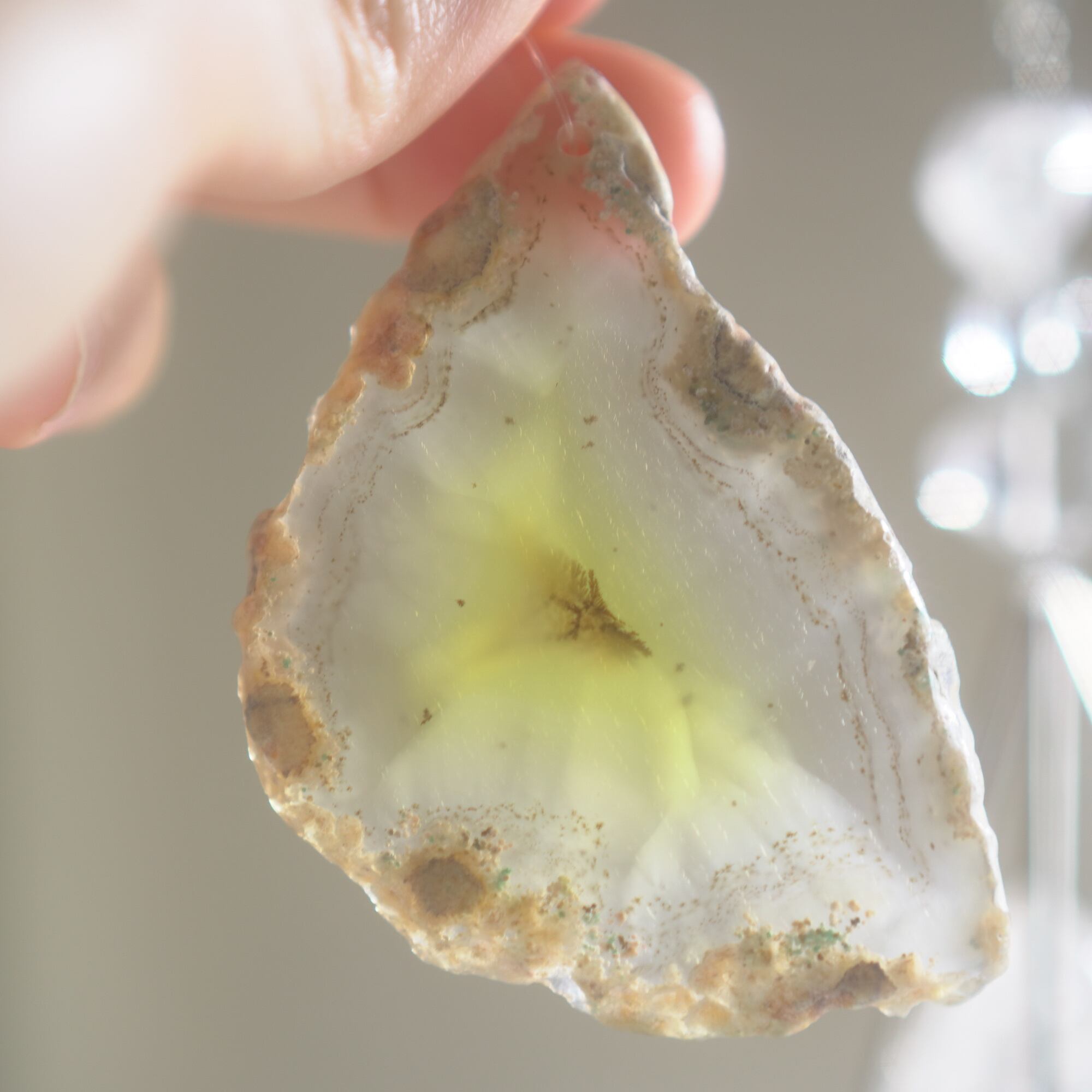 重ねる石同士の側面の加工状態によっても良い音が鳴ったり鳴らなかったり、石の見た目だけで組み合わせを決められないことが難しいポイントでもあるのですが、そんな中、たくさんの石の中から選ばれた5枚のスライスアゲートから出来上がったチャイムたちは、どこか悠々自適に空を泳ぐ妖精のようでもあり、それぞれの音を楽しそうに奏でてくれます。