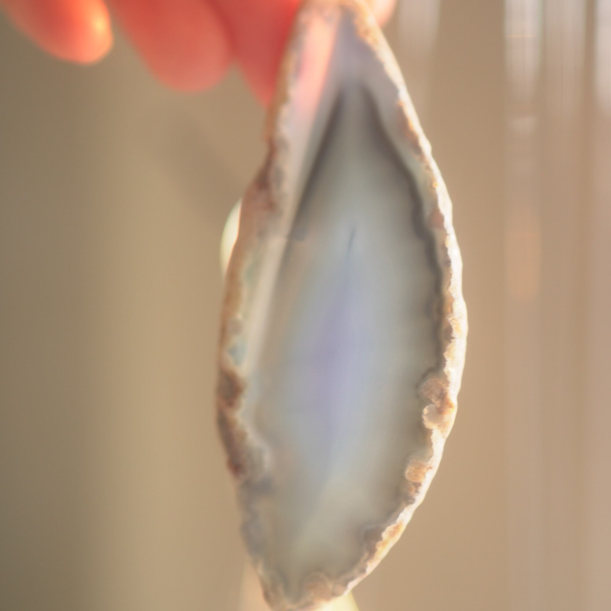 重ねる石同士の側面の加工状態によっても良い音が鳴ったり鳴らなかったり、石の見た目だけで組み合わせを決められないことが難しいポイントでもあるのですが、そんな中、たくさんの石の中から選ばれた5枚のスライスアゲートから出来上がったチャイムたちは、どこか悠々自適に空を泳ぐ妖精のようでもあり、それぞれの音を楽しそうに奏でてくれます。